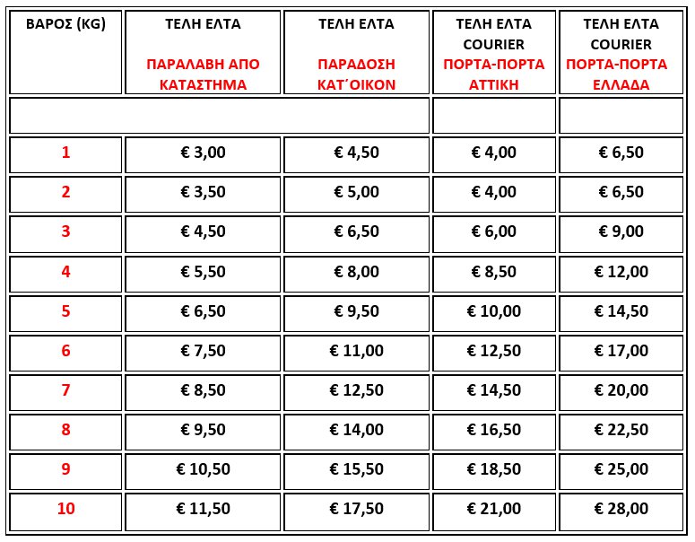 Αποστολή με ΕΛΤΑ ή Courier επιλογής μας.